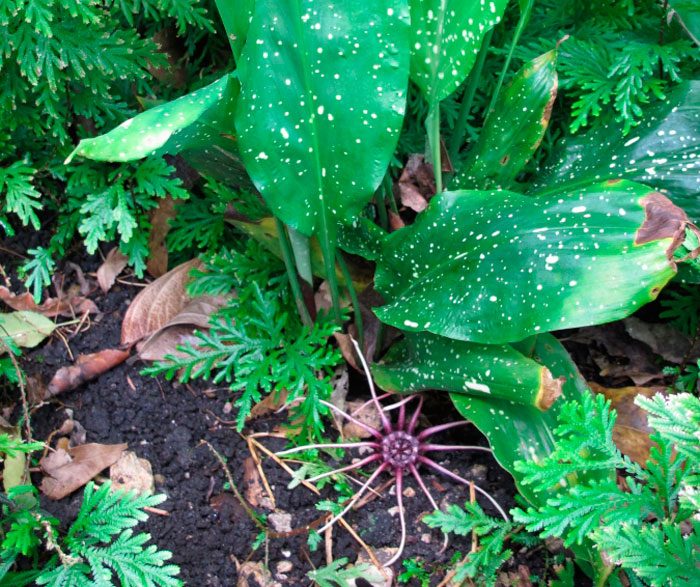 У цієї вічнозеленої рослини листові пластини мають довгі черешки (до 30 сантиметрів), а їх довжина може доходити до півметра. На їх поверхні знаходиться безліч дрібних білих цяток. Даний вид, як і багато інших, відрізняється невимогливістю у догляді. Він дуже витривалий і тому добре росте в прохолодному кліматі в місцях з загазованим повітрям. З часом кущ розростається і стає пишним. У підстави кореневища 1 раз в рік в перші літні тижні виростає маленький фіолетовий квітка. Після розкриття бутона квітка в поперечнику досягає близько 30 мм.