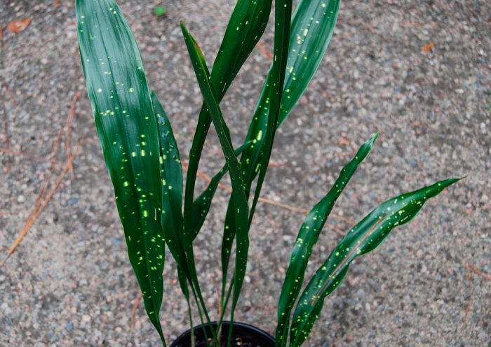 Цей вид відрізняється від інших тим, що його коротенькі (довжина до 20 сантиметрів) листові пластини мають довгі черешки, висота яких близько 40 сантиметрів. На поверхні широких щільних і листових пластин є цятки жовтуватого забарвлення. Початок цвітіння припадає на травень, у цей час на тоненьких корінцях утворюються парні нирки, а потім з них з'являються великі квітки, дуже схожі на ті, що формуються у аспидистри крупноквіткової. Розкрилися квітки мають фіолетовим або пурпурним забарвленням.