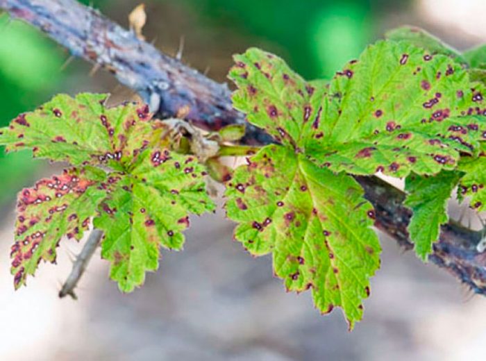 У уражених кущів малини на листі утворюються маленькі цятки округлої форми бурувато-сірого кольору з темно-червоним оздобленням. З часом цятки стає більше і поступово зливаються один з одним. На поверхні уражених стебел утворюються глибокі, але дрібні ранки. Уражені квіткові пагони, верхівки стебел і квітки засихають, а також спостерігається муміфікація плодів.
