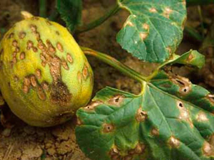 Всі надземні частини куща кабачків можуть бути уражені антракнозом. На поверхні листя з'являються цятки буро-жовтого кольору, а на плодах і пагонах утворюються вдавлені ділянки, які покриває наліт рожевого відтінку. Коренева частина куща, яка вражена антракнозом, найбільш часто гине.