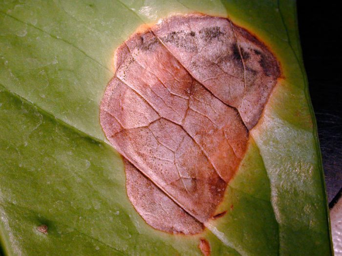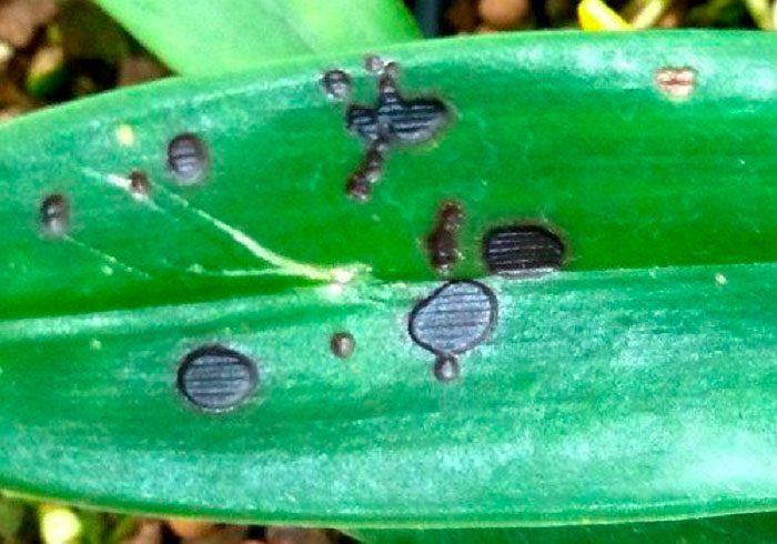 Уражені листові пластини відрізняються від здорових тим, що на них утворюються плями з дуже чіткими краями, це схоже з тим, ніби лист втиснули розпечену монетку. На листі фаленопсиса забарвлення цяток чорний, при цьому на інших видах орхідей їх колір може бути іншим, навіть білим. Біля основи листкових пластин уражених квіток з'являється пухке утворення. Спробуйте врятувати хоч частину ураженої листової пластини, якщо це можливо, при цьому місця зрізів потрібно обов'язково обробити зеленкою, подрібненим деревним вугіллям або порошком кориці. По можливості змініть субстрат на новий, при цьому ємність обов'язково обробіть міцним розчином марганцевого калію. Краще всього для обробки орхідей використовувати засоби останнього покоління: Триходермін, Фітоспорін-М або Бактофіт. Також уражене рослина можна обприскати органічними засобами, наприклад, Манебом, Манкозебом або іншим препаратом схожого дії.