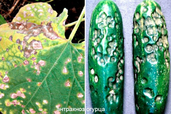 У огірків з-за антракнозу страждають пагони, плоди і листя. При цьому симптоми розвитку хвороби можуть бути виявлені вже в розсадному періоді: в районі кореневої шийки у сіянців з'являються вдавлені плями коричневого кольору, з часом вони стають виразками, із-за яких молоді рослинки вилягає. У дорослих кущів спочатку хворобою пошкоджуються листові пластини, на їх кромці з'являються цятки блідо-жовтого або коричневого кольору завбільшки 3-30 мм У кущів, що ростуть в теплиці, тканина листків з центру плям висипається і з'являються дірки округлої форми. У огірків, що знаходяться у відкритому грунті, ці плями мають щілиноподібної форми. Після того як будуть уражені антракнозом листові пластини і пагони, хвороба переходить на плоди, на них формуються довгасті вдавлені ділянки блідо-рожевого або коричневого відтінку, в глибину вони йдуть на 0,3–0,4 див.