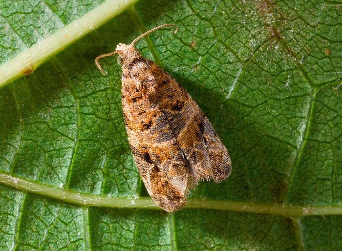- Гронова листовійка. Передні крила комахи пофарбовані в коричневий колір і на них є візерунок, що складається з поперечних смужок світлого відтінку, який розведений блідо-синіми і жовтими цятками.