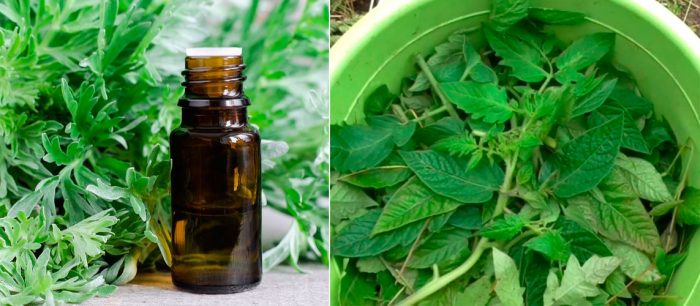 - Відвар бадилля помідорів. Відро води з'єднують з чотирма кілограмами дрібно порізаних коренів і свіжої зеленої бадилля помідорів, дають настоятися суміші від трьох до чотирьох годин. Потім її півгодини кип'ятять на невеликому вогні, коли засіб охолоне, його проціджують, при цьому рослинні залишки потрібно віджати. У щільно закритих пляшках зі скла зберігати відвар можна протягом 12 місяців, але тільки в прохолодному місці. Перед використанням відвар розводять водою (1:1), при цьому на кожні 10 літрів готового розчину кладуть 40 грам подрібненого мила.