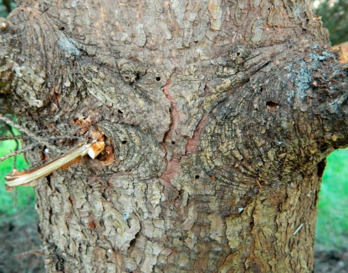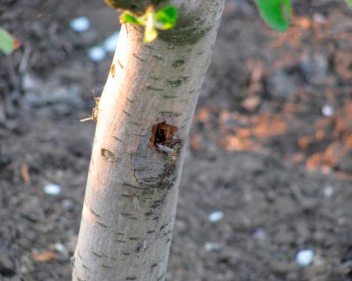 - Вчасно проводити санітарні та гігієнічні заходи: обрізати засохлі і уражені хворобою або морозом гілки, так як на них можуть оселитися жуки. Також потрібно вчасно очищати кору, дезінфікувати і замазувати морозобины і ранки, кожен рік білити штамб і підстави скелетних гілок вапном, очищати ділянку від опалого листя, проводити перекопування землі в пристовбурних кіл.