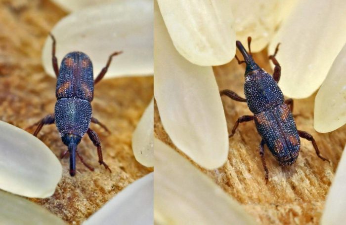 Довгоносик в будинку є тим же комірним довгоносиком в зерні, а потрапляє в квартиру разом з крупою, принесеної з магазину. Доросла самка прогризає в зернятку печерку і відкладає в неї всього одне яйце, після чого отвір вона залепливает власними виділеннями. Через 6-12 діб на світ з'являється личинка, вона виїдає внутрішню частину зерна, після чого прогризає оболонку і вибирається назовні. Боротьба з довгоносиком ускладнюється тим, що личинку, що знаходиться всередині зерна, виявити досить складно. Однак все ж таки були придумані різні способи боротьби з таким шкідником.