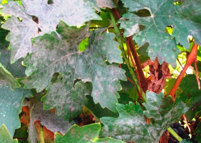 Та борошниста роса, якої може захворіти виноград, іменується оїдіум. Першими ознаками такого захворювання є все такий же наліт білого кольору, який утворюється на пагонах, плодах, листі і стеблах. Найбільш активно хвороба розвивається при високій вологості повітря і температурі від 18 до 25 градусів, але під час дощів спостерігається уповільнення поширення інфекції. У літній час, коли температура повітря не опускається нижче 20 градусів, виноград обробляють сіркою, так, для лікування використовують розчин, для приготування якого з'єднують 1 відро води і від 80 до 100 грам препарату, а в цілях профілактики для виготовлення суміші використовують від 25 до 40 грам речовини на 10 літрів води. Якщо ж стоїть прохолодна погода, тоді для обробки використовують сірчані препарати, наприклад, розчин колоїдної сірки. Але під час формування плодів застосовувати для обробки хімічні засоби не рекомендується. Не менше ніж за 30 діб до збирання врожаю треба припинити обприскування винограду тими препаратами, які токсичні для людського організму.