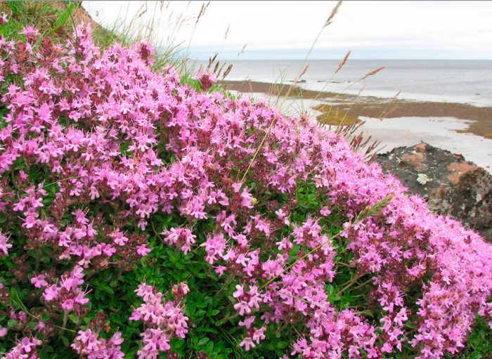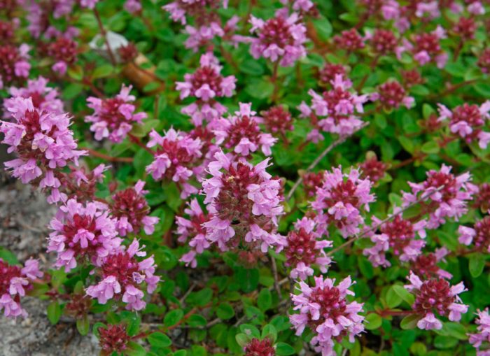 Таку рослину ще називають чабером, або чебрецем, в природних умовах воно зустрічається на території Сибіру, Західної Європи, Далекого Сходу і в європейській частині Росії. Така багаторічна рослина, що у висоту досягає близько 15 сантиметрів. Стебла повзучі циліндричної форми, в їх нижній частині знаходяться відстовбурчені волосисті пагони. Форма черешкового листових пластин ланцетоподібна, а в довжину вони досягають 10 мм. Висота квітконосів близько 15 сантиметрів. Розкриття голівчатих суцвіть спостерігається в липні, квітки забарвлені в лілово-рожевий колір. Культивується цей вид з 16 століття. Серед сортів такого виду зустрічаються такі, квітки яких забарвлені в білий, кармін і рожевий колір, а ще є форма із строкатим листям. Доглядають за таким видом точно так само, як і за почвопокровних рослиною.