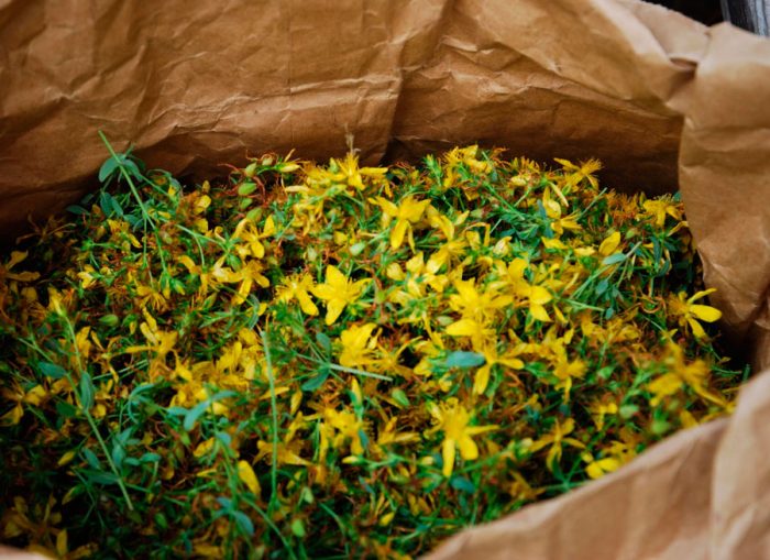 Пишно цвісти звіробій почне лише через 2 або 3 роки після появи сіянців. Як тільки це відбудеться, можна починати заготівлю трави. Збір сировини потрібно проводити під час цвітіння (з останніх днів червня до перших ― липня), а робити це треба в сонячну і суху погоду. Під час збору сировини треба обрізати верхні 25-30 сантиметрів пагонів. Для цього рекомендується використовувати серп, секатор або гострий ніж, однак якщо ділянка дуже велика, то краще скористатися косою. Зібрану сировину треба якомога швидше відправити на просушку, якщо цього не зробити, почнеться його почорніння і гниття. Для просушування траву розкладають у напівтемній кімнаті з доброю вентиляцією, при цьому температура повинна бути приблизно 50 градусів. Не забувайте регулярно перевертати і ворушити траву, це забезпечить рівномірне просихання. Як тільки пагони почнуть легко ламатися, а квіточки і листові пластини розсипатися, можна вважати, що процес сушіння закінчено. Готову сировину треба розкласти по банках з кераміки або скла, а також для цього можна використовувати картонні коробки або пакети з паперу. Зберігати звіробій треба при температурі повітря 5-25 градусів на протязі 3 років.