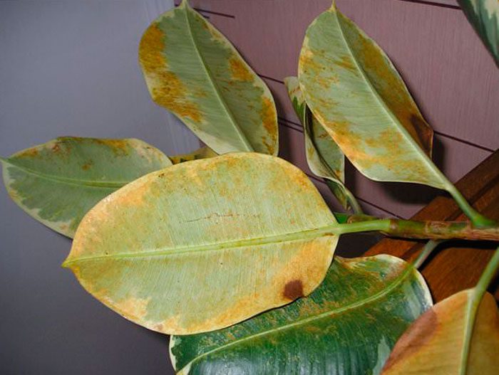 - Пожовтіння листя. Як правило, листові пластини спочатку стають жовтими, а потім відмирають і опадають. Тому причини пожовтіння листя дивіться вище. Однак листя може змінити свій колір на жовтий і з-за того, що в ґрунтосуміші дуже багато поживних речовин. В цьому випадку рекомендовано промивання субстрату, для цього за допомогою верхнього поливу в ємність виливається такий обсяг води, якою можна було б заповнити 3 таких порожніх квіткового горщика, в якому росте фікус. Після промивання підгодівлі припиняють на 8 тижнів. Також пожовтіння може бути пов'язано з тим, що в землесуміші міститься дуже багато солей, в даному випадку виправити ситуацію допоможе лише пересадка квітки в свіжий субстрат. Ще листя жовтіють тоді, коли фікус зростає в надмірно великої ємності, в цьому випадку його необхідно пересадити в новий горщик меншого обсягу. Також жовті листя можуть бути ознакою того, що на коренях з'явилася гниль. Якщо понюхати грунтосуміш, то від неї буде пахнути гниллю. В цьому випадку треба витягнути кущ з ємності, звільнити його кореневу систему від землі, вирізати всі загнили ділянки, після чого його висаджують в свіжий субстрат. Однак бувають випадки, коли загнили рослина врятувати не вдається.