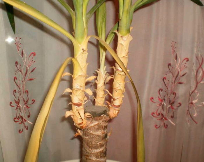- Юка жовтіє. При пожовтінні нижніх листових пластин у юки лякатися не варто, так як це природний процес. Справа в тому, що зелені листові пластини можуть перебувати тільки на верхівці куща. Незвичайний зовнішній вигляд такого рослини пов'язаний саме з тим, що воно скидає нижні листові пластини.