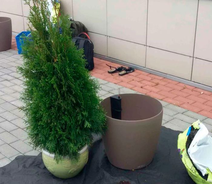 Вибір розміру ємності для кімнатної туї безпосередньо залежить від величини системи коренів. Також потрібно врахувати, що корені у рослини довгі, тому ємність повинна бути досить високою. Якщо дерево велике, тоді для нього слід придбати стійку ємність. Під час пересадки новий горщик повинен бути в діаметрі більшого старого на 20 мм. А при виборі висоти горщика враховуйте, що на його дні треба обов'язково зробити дренажний шар, товщина якого дорівнює декільком сантиметрам. Ще зверніть увагу на дно ємності, так як на ній повинні обов'язково бути отвори для дренажу.