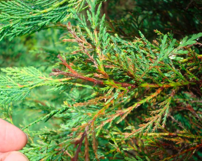 З-за фузаріуму хвоя забарвлюється в рудувато-червоний відтінок, а потім починає в'янути. Ще від цієї хвороби страждає коренева система куща, з-за чого він може загинути. Хворе деревце обприскують розчином Картоцида або бордоської суміші. Тую регулярно обприскують 1 раз на півмісяця, поки вона повністю не одужає.